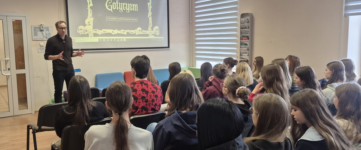 Literaturoznawca wygłosił prelekcję zatytułowaną „Gotycyzm – u korzeni nowoczesnej grozy”. Prezentacja dotyczyła ewolucji literatury grozy na przykładzie gotycyzmu w literaturze powszechnej i polskiej XVIII i XIX wieku. Obejmowała również współczesną recepcję tego zjawiska. Entuzjastyczne przyjęcie doktora Andruczyka przez uczniów i ich żywe zainteresowanie prezentowaną tematyką pozwalają sądzić, że spotkania te będą kontynuowane.