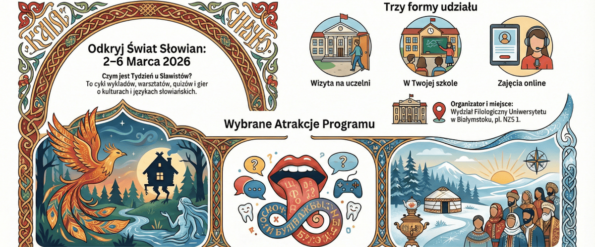 W dniach 2–6 marca 2026 roku na Wydziale Filologicznym Uniwersytetu w Białymstoku odbędzie się „Tydzień u Slawistów” – wydarzenie edukacyjne przygotowane przez pracowników filologii rosyjskiej oraz etnofilologii białoruskiej.