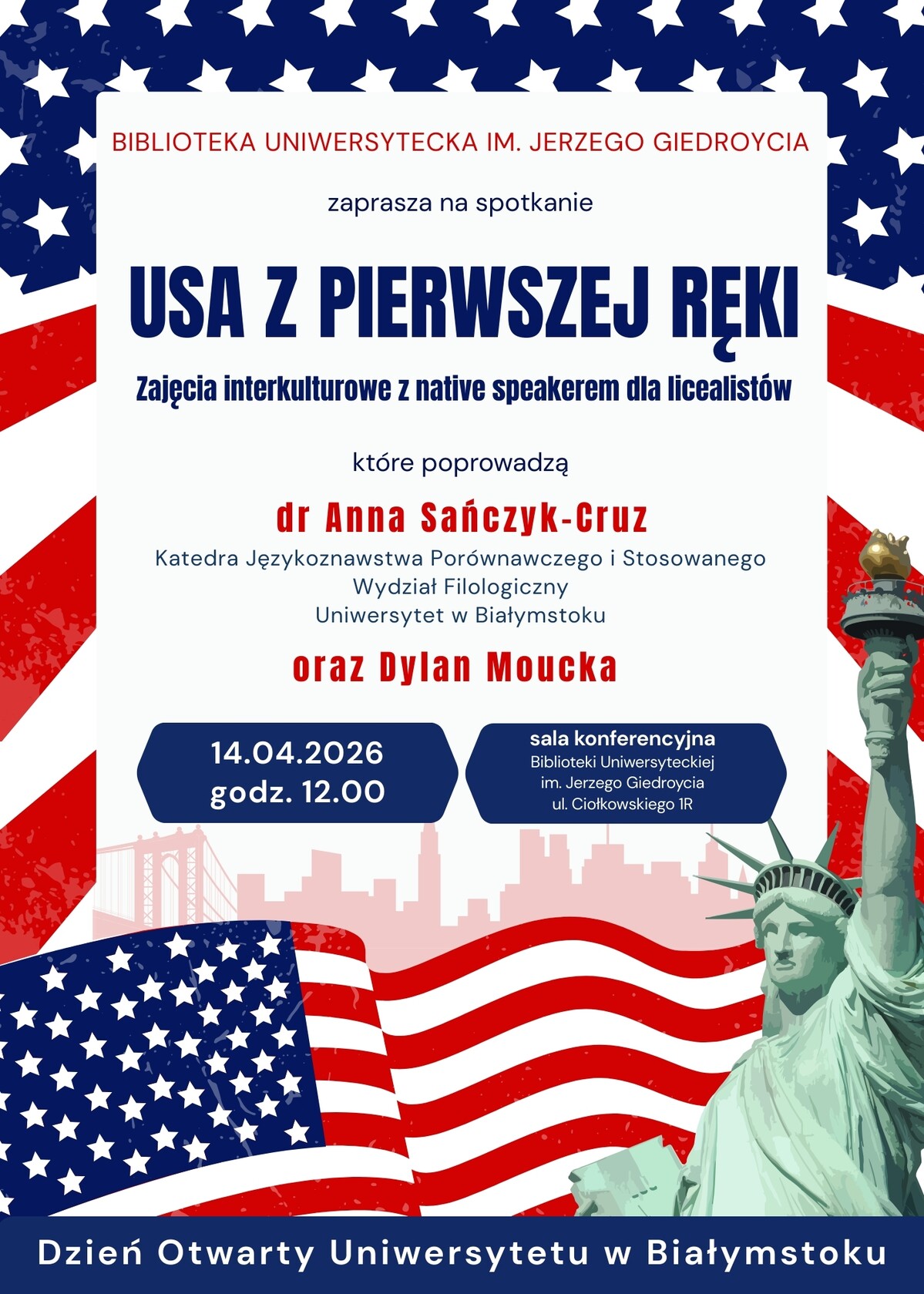 Wspólnie zaprezentują oni odsłonę USA w praktyce, łącząc różne perspektywy dydaktyczne, dialog międzykulturowy oraz aktywne metody pracy. Zajęcia zostały pomyślane z myślą o uczniach szkół ponadpodstawowych: uczestnicy będą włączeni w krótkie ćwiczenia, dyskusje i zadania, dzięki czemu doświadczą bezpośredniego kontaktu z językiem i kulturą amerykańską w angażującej, warsztatowej formie.