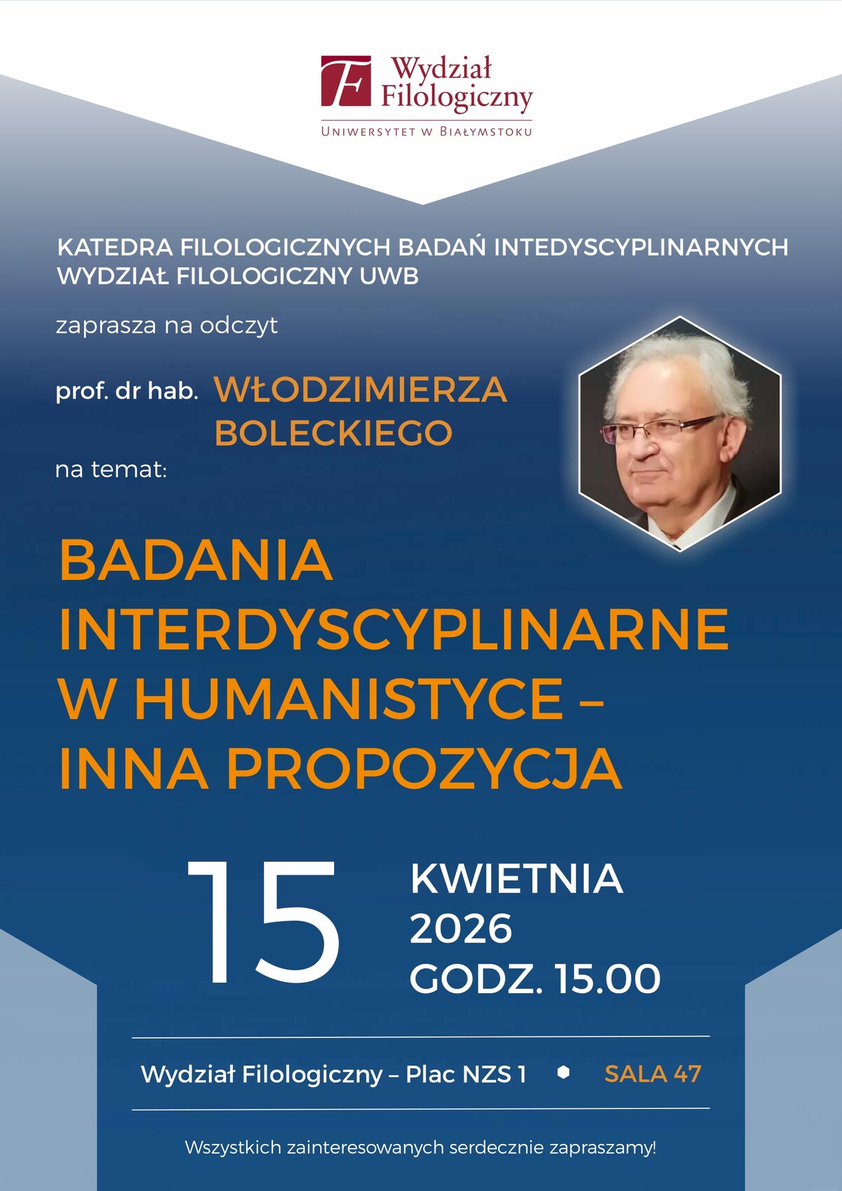 Wydarzenie odbędzie się 15 kwietnia 2026 roku o godz. 15:00 na Uniwersytet w Białymstoku, Wydział Filologiczny (Plac NZS 1), sala 47.